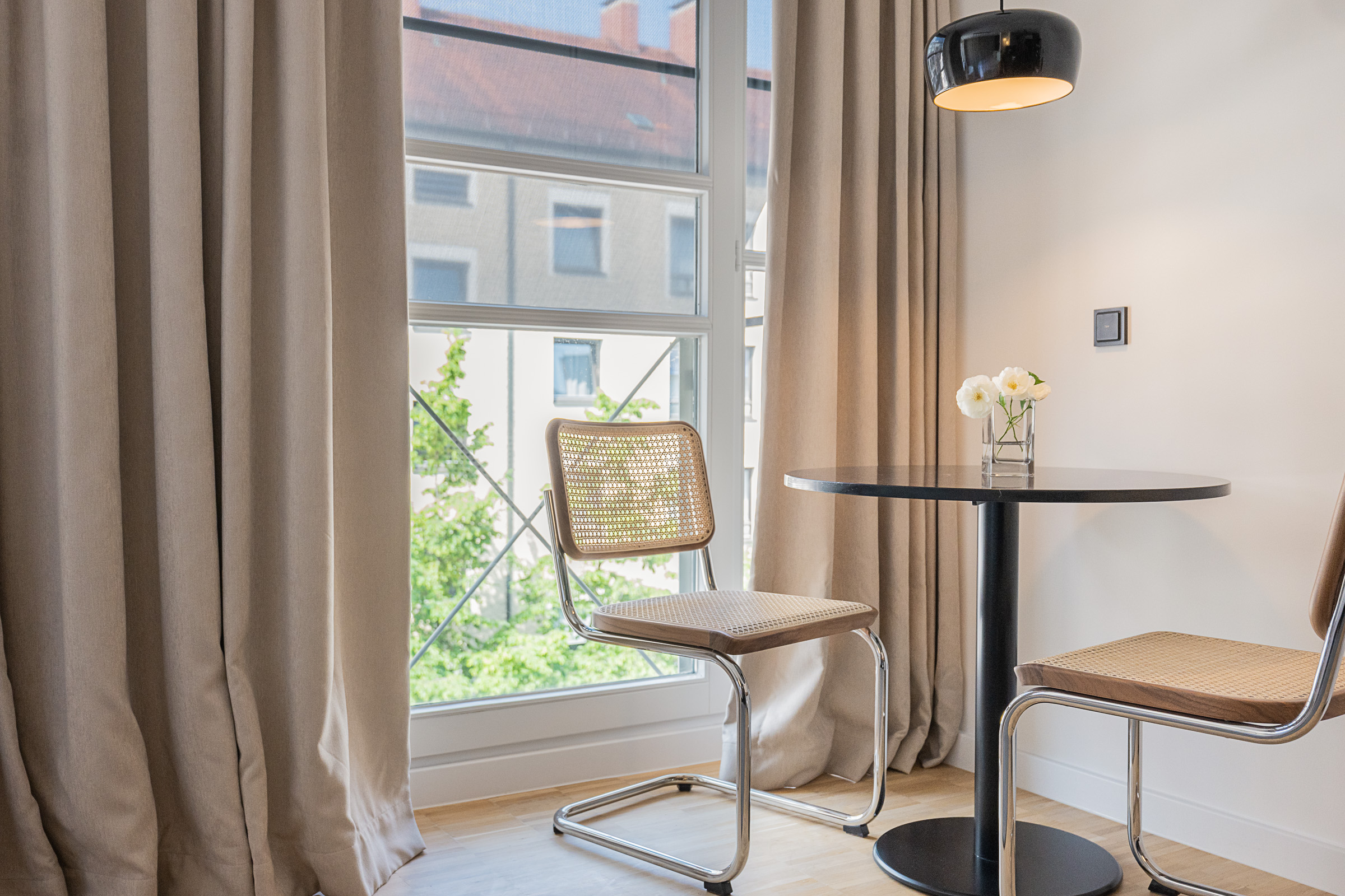 München, Schwabing, Fallmerayerstraße 22 … das Serviced Apartment Haus bietet attraktive Wohnstudios und Penthousewohnungen in vier verschiedenen Größen von 18 bis 24 qm. Alle Einheiten sind mit Designküche, hochwertigem Bett, viel Stauraum, Sessel und / oder Sofa sowie einladendem Essbereich für zwei Personen ausgestattet.