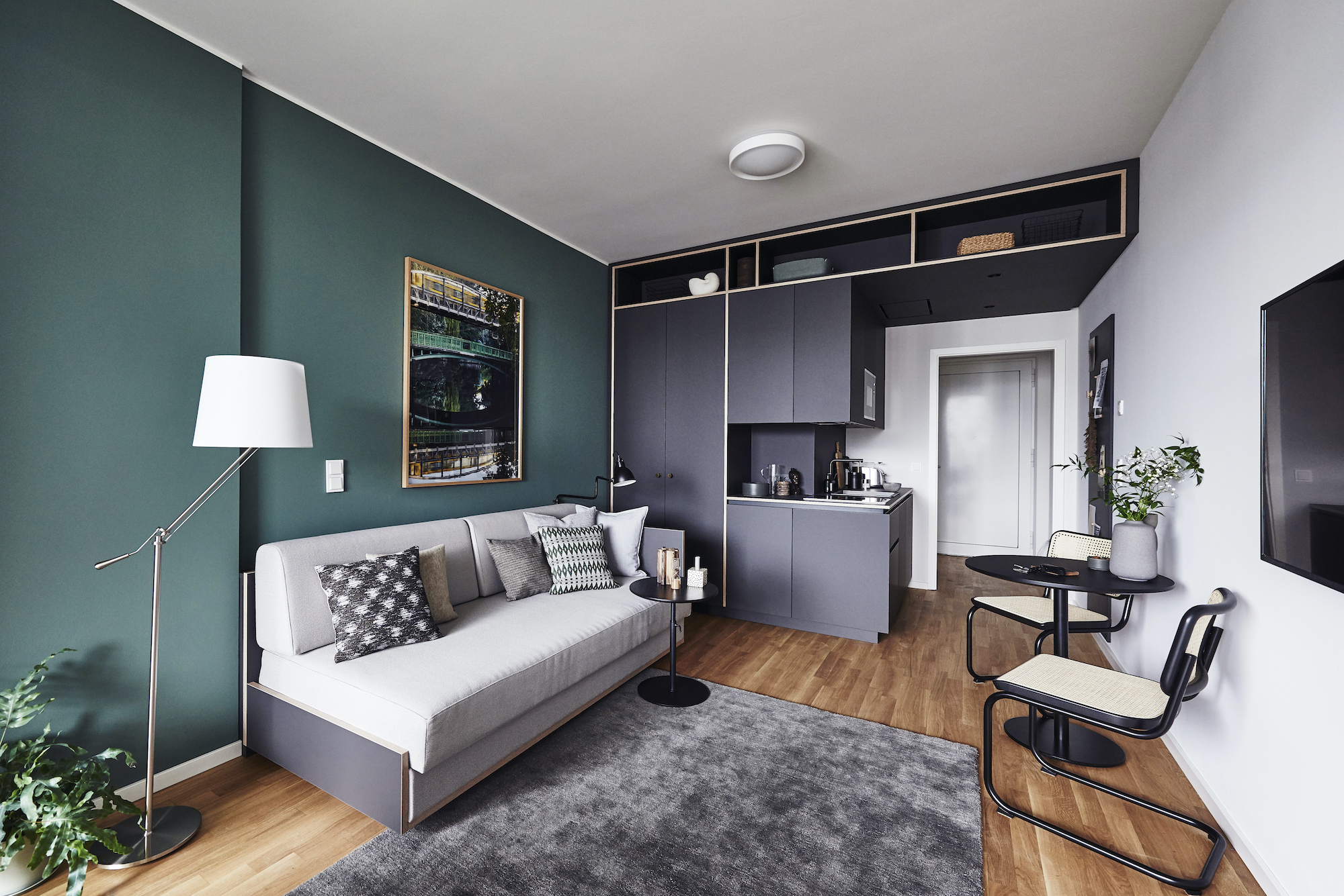 Für die kleinen feinen Wohneinheiten nur das Beste! Gerade mal 20 bis 34 qm sind die 66 Mikro-Apartments groß. Und doch findet sich für alles Platz. Mit wenigen Handgriffen verwandelt sich das Sofa zum Bett mit USB-Steckdose und mächtig viel Stauraum. Speicherplatz auch direkt unter der Decke zählt zu den weiteren Raffinessen, die Mieterherzen höherschlagen lassen.